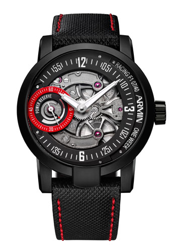 Szwajcarska marka Armin Strom od niedawna produkuje własne mechanizmy, dzięki czemu może dokładniej kontrolować proces ich powstawania. Niedawno firma rozpoczęła współpracę z młodym, rosyjsko-brytyjskim teamem Formuły 1 Marussia Virgin Racing. To skłoniło konstruktorów do stworzenia nowej serii zegarków związanych z Formułą 1. Co ciekawe, płyty i mostki mechanizmu napędzającego model Armin Racing One Week wykonane zostały z części silnika, które pod koniec obróbki poddano specjalnemu procesowi, aby uzyskały bardziej techniczny wygląd. Dodatkowo, 43-milimetrowa, stalowa koperta pokryta została czarną powłoką PVD. Dzięki temu, że tarcza nie przesłania całego mechanizmu, można podziwiać niektóre jego elementy. Zegarek utrzymany jest w czerni z jednym, mocnym akcentem kolorystycznym: zaznaczonym na czerwono małym sekundnikiem, z którym zintegrowane jest wskazanie rezerwy chodu. Model Armin Racing One Week pochodzi z limitowanej serii (40 egzemplarzy) i kosztuje 23 550 euro.