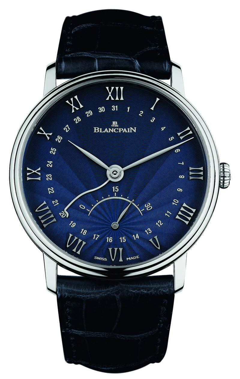 Jak widać, kolor niebieski nadal nie wychodzi z mody. Dowodem na to jest nowy model z kolekcji Villeret. Ciemnoniebieska tarcza wykonana została w nim z wielu warstw niebieskiego lakieru, dzięki czemu uzyskano ciekawą głębię. Ten klasyczny czasomierz ma 40-milimetrową kopertę wykonaną z białego złota, w której ukryty jest składający się z 244 części, automatyczny kaliber 7663Q z 3-dniową rezerwą chodu. Oprócz wskazań godzin i minut, na tarczy widoczne są także wskazania datownika (obsługiwane za pomocą wskazówki) oraz skaczącego wskazania sekundnika znajdującego się na godzinie 6. Za pomocą korektora znajdującego się pod uszami (przy godzinie 5) można szybko skorygować wskazania datownika. Villeret ma przezroczysty dekiel, przez który widać pracujący pod nim mechanizm z charakterystycznym dla tej kolekcji giloszowanym wahnikiem.