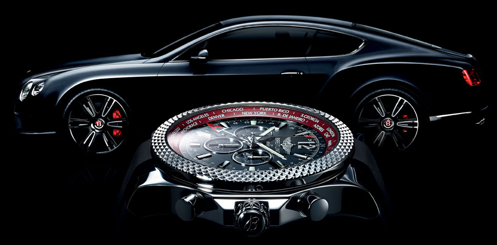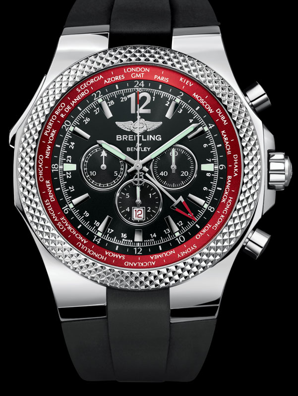 W tym roku mija dziesięć lat od momentu nawiązania współpracy dwóch wyjątkowych marek: Breitling i Bentley. Co roku, Breitling prezentuje specjalną serię modeli inspirowanych samochodami marki Bentley i sygnowanych charakterystycznym, uskrzydlonym „B“. Tym razem, niemal równocześnie z prezentacją nowego, luksusowego Continentala GT V8, firma Breitling pokazała model z limitowanej serii obejmującej 250 egzemplarzy. Oprócz wskazań stopera, Chronograph Bentley GMT „V8“, bo o nim mowa, ma typowy dla tej serii, żłobkowany pierścień, dzięki któremu można ustawić czas drugiej strefy (obsługiwany za pomocą wskazówki zakończonej czerwoną strzałką). Ustawienie czasu ułatwia okalający tarczę czerwony okrąg, na którym umieszczone zostały nazwy miast charakterystycznych dla każdej z 24 stref.