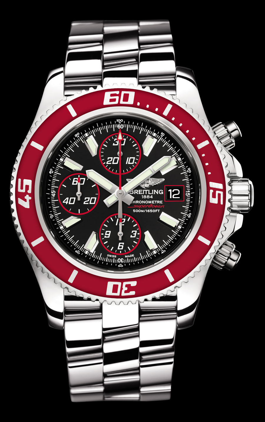 Znany już ze swojej dużej wodoszczelności wynoszącej 50 atm, model Superocean Chronograph marki Breitling pojawił się w specjalnej, limitowanej serii obejmującej 2000 egzemplarzy. Jego znak rozpoznawczy to: czerwony pierścień wykonany z kauczuku i zaznaczone na czerwono liczniki. Zegarek opakowany jest w 44-milimetrową stalową kopertę, w której pracuje automatyczny kaliber Breitling 13 (powstał na podstawie kalibru ETA/Valjoux 7750. W wersji ze skórzanym paskiem Superocean Chronograph II kosztuje 4770 euro, a ze stalową bransoletą 5090 euro.