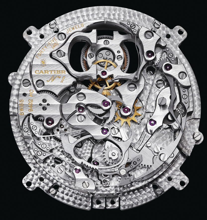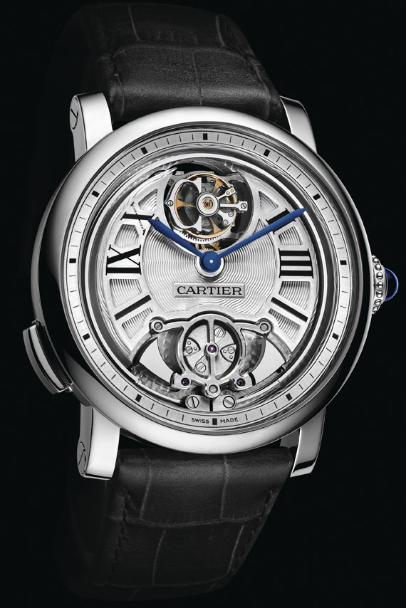 Model Flying Tourbillon Minute Repeater marki Cartier łączy w sobie funkcję tourbillonu oraz minutowej repetycji. Godziny, kwadranse i minuty wybijane są za pomocą dwóch młoteczków znajdujących się na godzinie 6. To ciekawe rozwiązanie techniczne nie zostało ukryte. Niemal cała konstrukcja repetiera widoczna jest przez spore okno w tarczy. Tak jak w przypadku większości minutowych repeterierów godziny wybijane są niższymi dźwiękami niż minuty, a do wybijania kwadransów służą oba młoteczki.