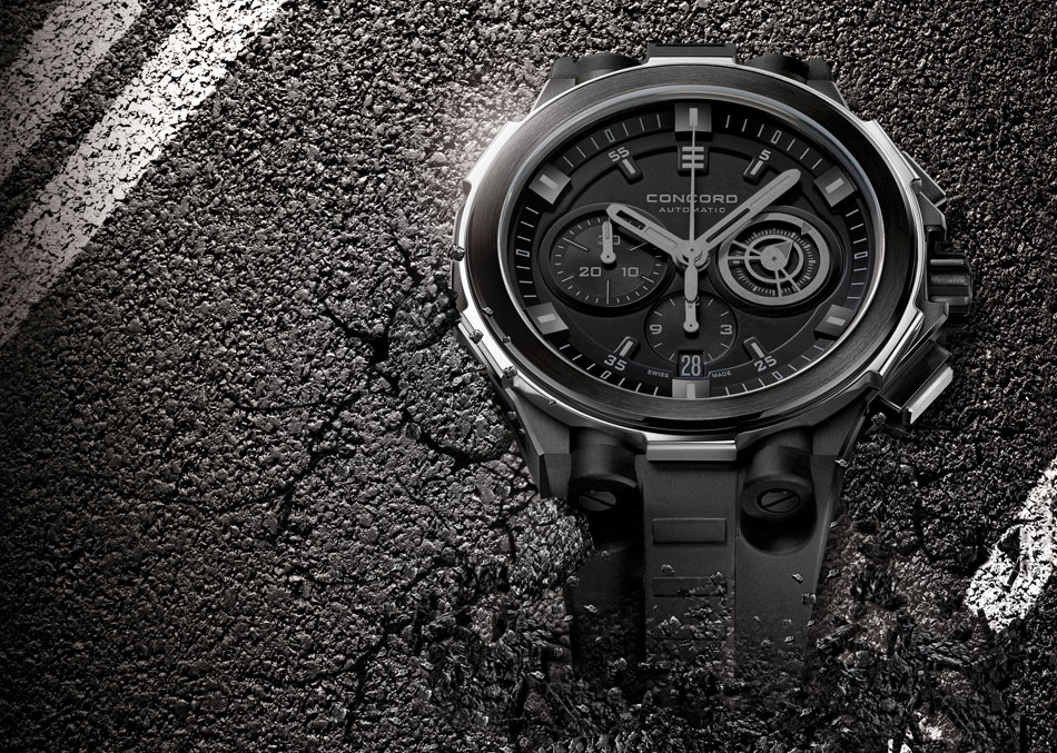 Filozofia marki Concord opiera się na produkcji sportowych modeli, dlatego nie dziwi fakt, że czasomierz C2 Asphalt Black wyróżnia się bardzo dynamiczną formą: ma stalową 43-milimetrową kopertę w większości pokrytą czarną powłoką PVD i kauczukowy pasek podkreślający jego sportowy charakter. Jako napęd posłużył tu kaliber ETA 2894 ze stoperem, który mierzy czas do 12 godzin. Uzupełnieniem tego rasowego wyglądu jest przyciemnione szafirowe szkło o grubości 2 mm. Cena: 5900 euro.