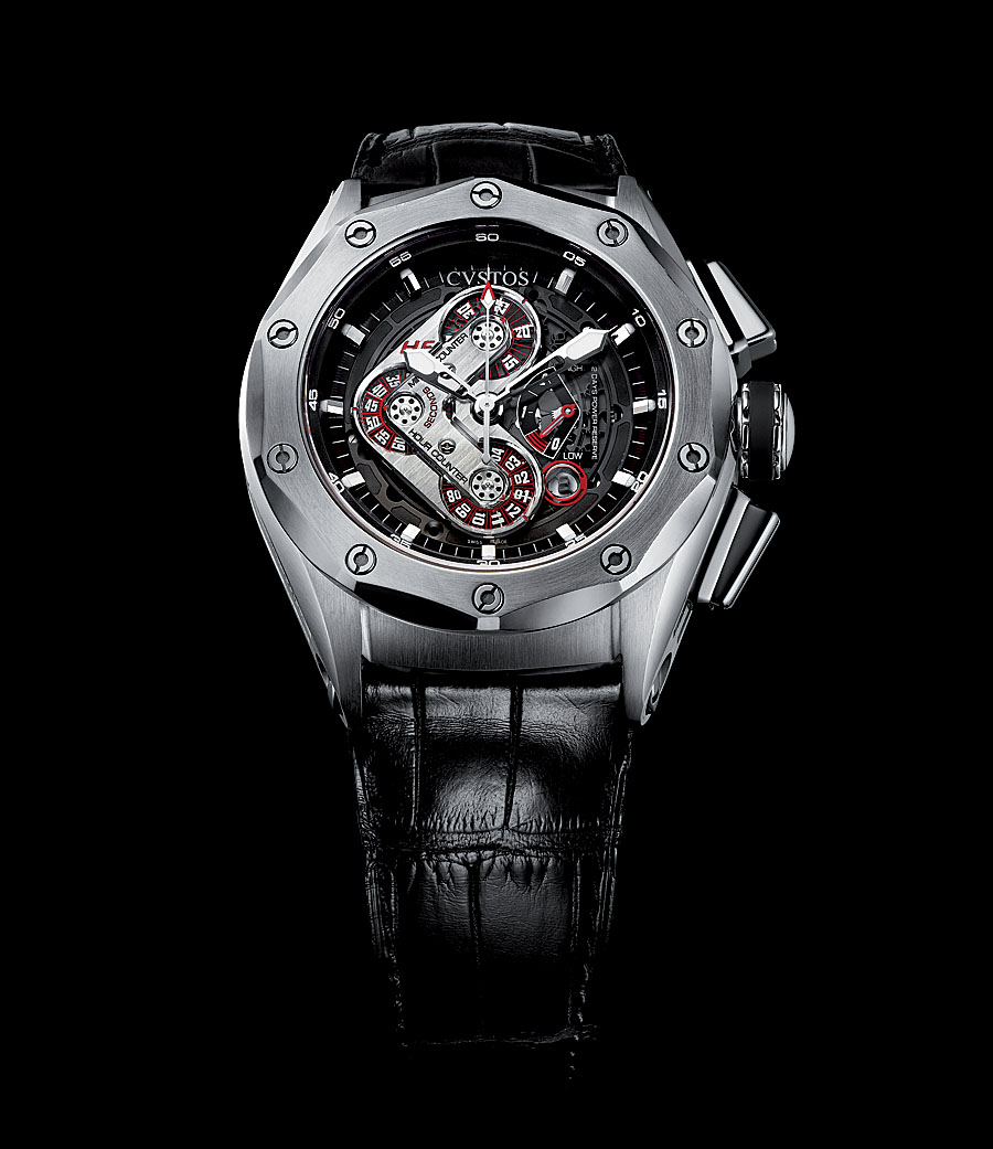 W modelu Challenge R50 Chrono High Fidelity, firma Custos zastosowała ciekawe rozwiązanie dla datownika: jego wskazania umieszczone są na pierścieniu z wyciętymi cyframi i kiedy pierścień znajdzie się na białym tle, w oknie na godzinie 5 widać aktualne wskazanie daty. W tym ciekawie prezentującym się czasomierzu zastosowano sprawdzony automatyczny kaliber Valjoux 7750, który poddano modyfikacjom i który, oprócz funkcji datownika oraz stopera ma także wskaźnik rezerwy chodu. Oba liczniki stopera oraz mały sekundnik połączone zostały oryginalnym mostkiem, dzięki czemu zegarek zyskał bardziej dynamiczny wygląd. Jednak oryginalność kosztuje: za ten opakowany w stalową kopertę model ze stoperem trzeba zapłacić 23 000 euro.