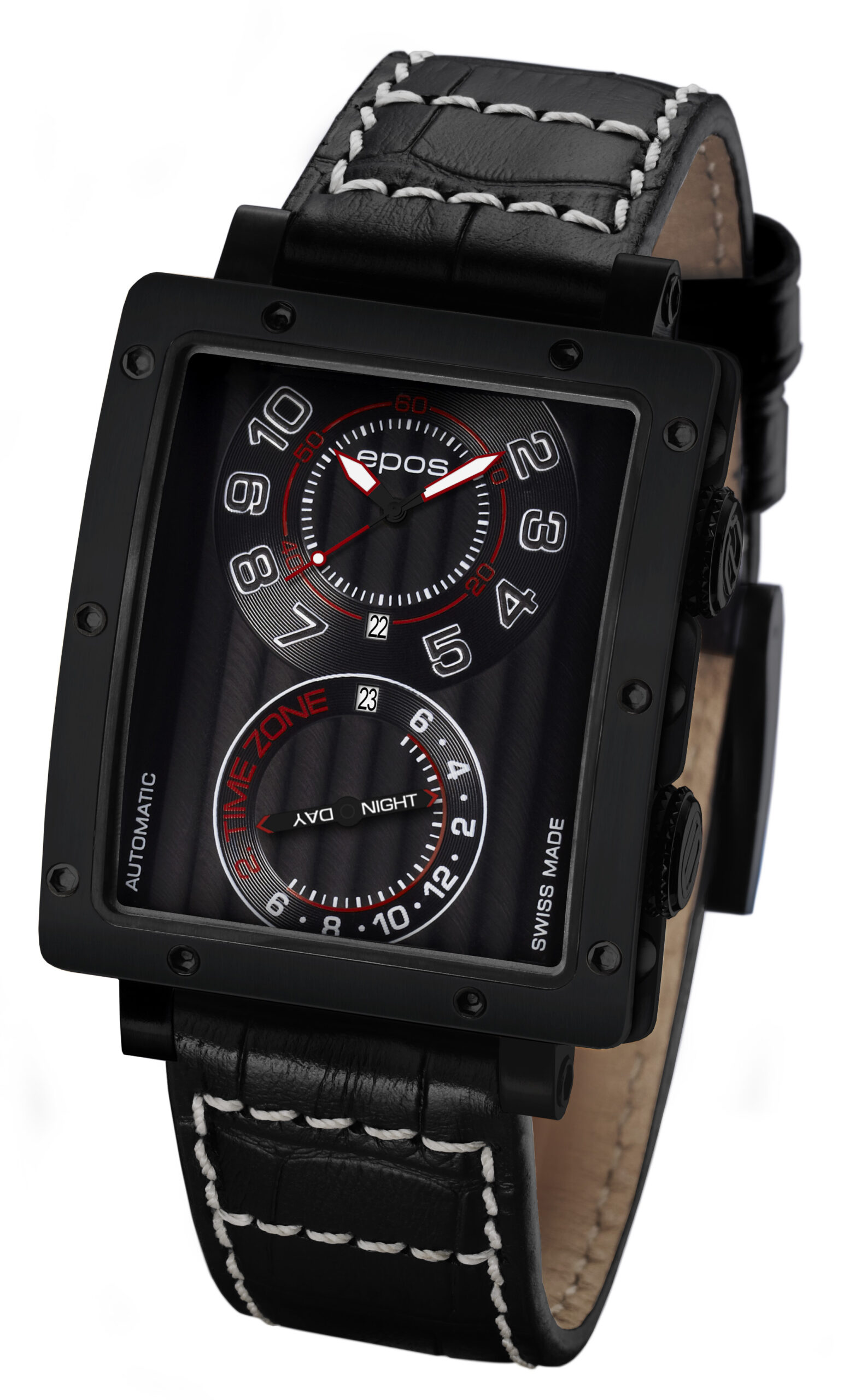 Jedna z ciekawostek najnowszej kolekcji marki Epos – model wyposażony w dwa niezależne mechanizmy automatyczne. Pierwszy wskazuje czas, drugi został zmodyfikowany dla wskazań czasu drugiej strefy czasowej. Zegarek dostępny jest w dwóch wersjach: z kopertą pokrytą czarną powłoką PVD lub z powłoką z żółtego złota. Cena: od 1750 euro.