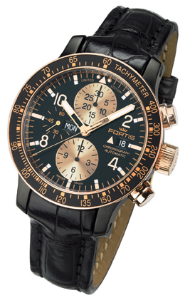 Koperta pokryta czarną powłoką i ozdobiona elementami z różowego złota – to znaki rozpoznawcze nowego modelu Stratoliner firmy Fortis. Dostępny jest w limitowanej serii 100 egzemplarzy w cenie 5920 euro (pasek ze skóry cielęcej; za pasek ze skóry krokodyla należy dopłacić 500 euro). Tym, którzy chcieliby otrzymać wersję mniej ekskluzywną, firma proponuje model w stalowej kopercie pokrytej czarną powłoką (seria limitowana do 2012 egzemplarzy).