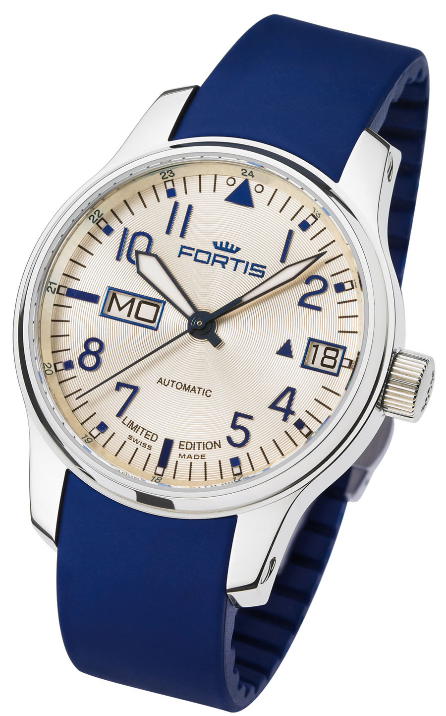 W swoim jubileuszowym roku firma Fortis pokzała m.in. model F-43 Flieger Big Day Big Date. Ten trzywskazówkowy zegarek prezentuje się dosyć skromnie: ma wskazania czasu, dnia tygodnia oraz datownik. Jego 43-milimetrowa stalowa koperta jest wodoszczelna do 200 m i ukrywa automatyczny mechanizm. Wszystkie modele z kolekcji F-43 mają czarne lub srebrne tarcze i różnokolorowe paski. F-43 Flieger Big Day Big Date z niebieskim, silikonowym paskiem pochodzi z limitowanej serii obejmującej 2012 egzemplarzy.