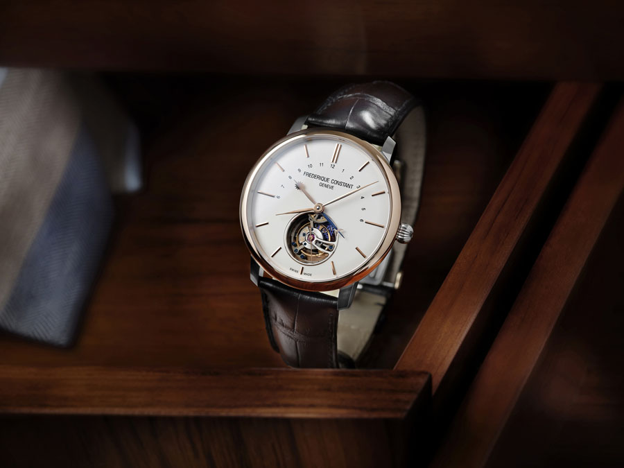 Marka Frédérique Constant zaprezentowała niezwykły model: Limited Edition Slimline Tourbillon Manufacture ma klasyczne, ponadczasowe wzornictwo i jak sama nazwa wskazuje, pochodzi z limitowanej serii obejmującej 188 egzemplarzy (każdy oferowany jest w eleganckim, drewnianym pudełku). A co kryje się w stalowej kopercie, która może być ozdobiona pierścieniem z różowego złota? Stworzony we własnej manufakturze, zaawansowany technologicznie automatyczny mechanizm, w którym kotwica i koło wychwytowe wykonane zostały z krzemu. Balans tego kalibru pracuje z częstotliwością 28 800 wahnięć na godzinę, a rezerwa chodu wynosi 42 godziny. Na srebrnej, wypukłej tarczy widoczne są nakładane, pozłacane indeksy godzinowe, wskaźnik dzień/noc i przede wszystkim pięknie wyeksponowana na godzinie 6 klatka 60-sekundowego tourbillonu.