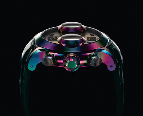W jaki sposób udało się uzyskać taki efekt? Stalową kopertę pokryto najpierw czarną powłoką PVD, następnie obudowę umieszczono w komorze próżniowej, aby tam nanieść na nią wiele bardzo cienkich warstw powłoki tlenkowej. Na utworzonej w ten sposób powierzchni, padające promienie świetlne nieregularnie się na siebie nakładają, dzięki czemu odcień koperty ciągle się zmienia. Aby dodatkowo podkreślić ten ciekawy efekt, projektanci zdecydowali się wykorzystać tarczę wykonaną z mieniącej się masy perłowej.