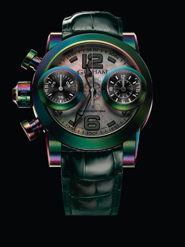 Z innego materiału powstały jedynie dwa liczniki stopera, nad którymi znajdują się lupy powiększające wskazania o 15 procent. Tej gry barw nie da się przeoczyć, ponieważ model Swordfish Booster Iris ma ogromną kopertę o średnicy 48 mm. W środku pracuje zmodyfikowany kaliber Valjoux. Ta niezwykła gra barw wyceniona została na 15 000 franków szwajcarskich.