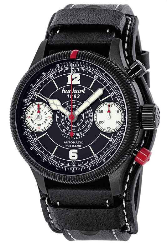 Przypadająca w tym roku 130 rocznica istnienia stała się dla niemiecko-szwajcarskiej firmy Hanhart okazją do zaprezentowania specjalnej limitowanej serii Pioneer Stealth 1882 (130 egzemplarzy). Ten zegarek dla pilotów zawdzięcza swoją nazwę technice stealth, dzięki której samoloty mają zapewniony kamuflaż i nie są wykrywane mimo, że latają nisko nad ziemią. Zegarek Pioneer Stealth 1882 cały utrzymany jest w czerni: jego 45-milimetrowa stalowa koperta pokryta została powłoką ADLC. W środkowej części czarnej tarczy umieszczono podziałkę tachometru, którą uzupełnia znajdująca się na obrzeżach tarczy skala telemetru. Przy pomocy obu podziałek można zmierzyć średnią prędkość oraz odległość. Ten „zamaskowany” czasomierz ma bardzo czytelną tarczę, m.in. dzięki zastosowaniu dużej ilości masy świecącej na tarczy oraz symetrycznym wskazaniom. I tak, ciekawie prezentuje się mały sekundnik zintegrowany z licznikiem 12-godzinnym na godzinie 9, który został symetrycznie umieszczony wraz z licznikiem minutowym stopera znajdującym się na godzinie 3. Za tym rozwiązaniem ukrywa się automatyczny kaliber Sellita SW-500 z modułem powracającej wskazówki stopera stworzonym przez firmę La-Joux-Perret. Model Pioneer Stealth 1882 ma także charakterystyczny dla firmy Hanhart przesunięty nieco do góry przycisk obsługujący stoper oraz zaznaczony na czerwono drugi przycisk. Oprócz prezentowanej wersji, dostępny jest także w tej z gładkim pierścieniem. Jego cena waha się między 6200 a 6350 euro.