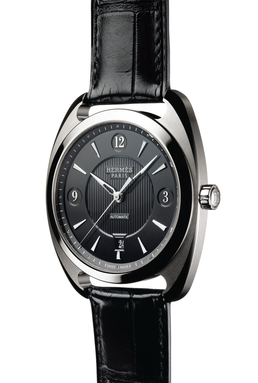 Najnowszy model Dressage marki Hermès ma ładnie zaprojektowaną stalową kopertę z polerowanymi i satynowanymi powierzchniami, która łagodnie przechodzi w elegancki, skórzany pasek uszyty ze skóry aligatora. Przy dokładniejszym przyjrzeniu się można zauważyć ciekawe detale: tarcza zegarka składa się z dwóch poziomów i widać na niej delikatne wskazówki oraz nakładane fasetowe indeksy. Model Dressage napędzany jest pochodzącym z manufaktury Vaucher automatycznym kalibrem H1837 ze wskazaniami godzin, minut, sekund i datownikiem. Cena: 6600 euro.