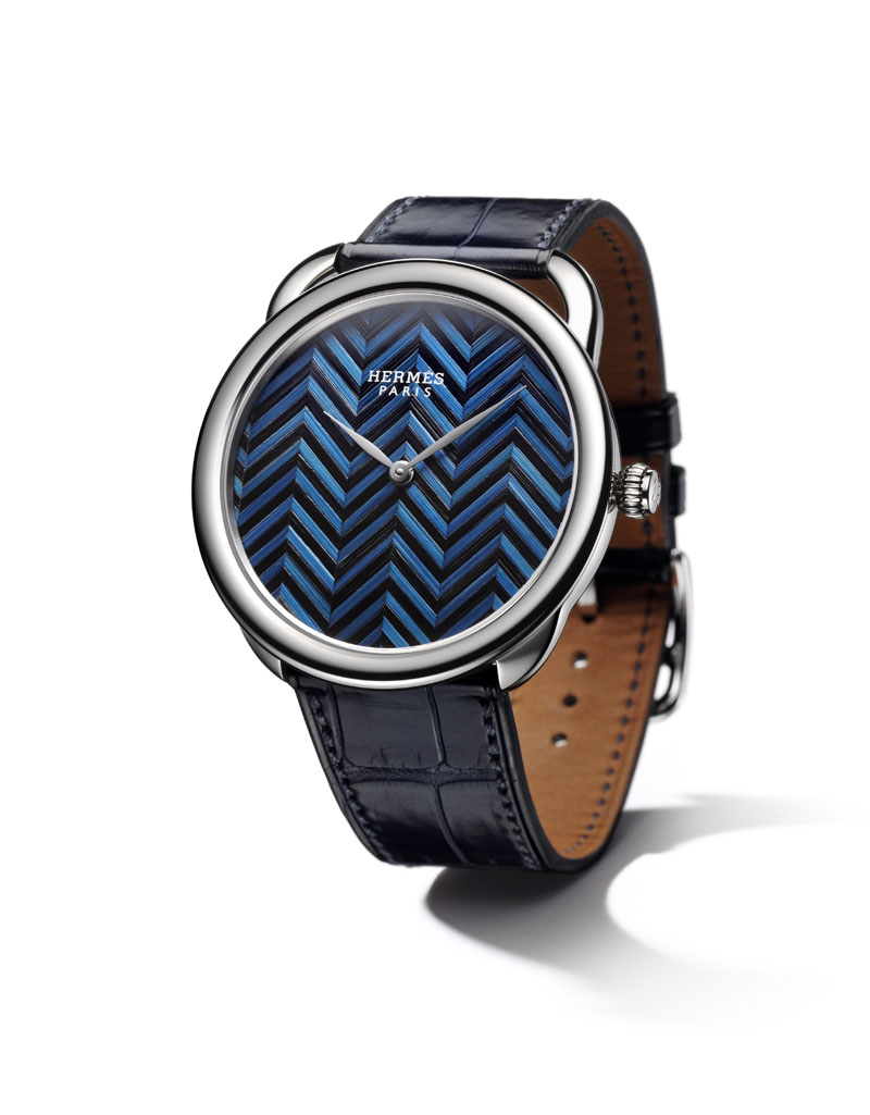Prezentując model Arceau Marqueterie de Paille firma Hermès udowodniła, że odkrywanie na nowo tradycyjnego rzemiosła może być fascynujące. Tarcza tego zegarka wykonana jest bowiem z niebieskiej i czarnej słomy. Aby uzyskać tak ciekawy efekt, należało w odpowiedni sposób przyciąć źdźbła żyta, zafarbować je, a następnie nakleić na papier tak, aby powstały zaprojektowane wcześniej wzory. To oryginalne dzieło opakowane jest w kopertę z polerowanego białego złota, w której pracuje automatyczny kaliber H1928 pochodzący z Vaucher Manufacture Fleurier, firmy należącej do Fundacji Rodziny Sandoz. Całość uzupełnia niebieski pasek ze skóry krokodyla.