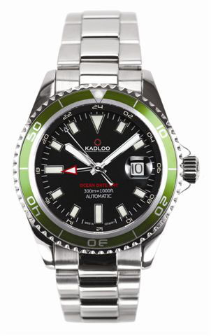 Model Ocean Time GMT Automatic marki Kadloo może odmierzać czas nie tylko w morskich głębinach, ale także w innych strefach czasowych. 43-milimetrowa stalowa koperta ma zakręcaną koronkę i jest wodoszczelna do 30 atm. Wystarczająca ilość masy świecącej na wskazówkach i indeksach godzinowych zapewnia bardzo dobrą czytelność wskazań, nawet pod wodą. Zielony, jednostronnie obrotowy pierścień dodaje zegarkowi bardziej sportowego charakteru. Wskazania czasu drugiej strefy (na 24-godzinnej podziałce) obsługiwane są za pomocą wskazówki zakończonej czerwoną strzałką. W kopercie pracuje chiński, automatyczny mechanizm Seagull 2893. Cena: 599 euro.