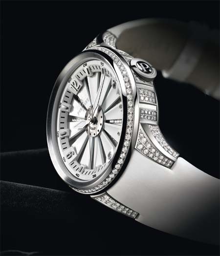 Model Turbine XS to najnowsza propozycja dla pań i jest dostępny w dwóch wersjach kolorystycznych: białej i czarnej. Obie mają 41-milimetrową stalową kopertę i napędzane są automatycznym kalibrem P-181 z charakterystycznym dla marki Perrelet podwójnym wahnikiem. Turbine XS ma pierścień i uszy wysadzane brylantami oraz elegancki, satynowy pasek. Cena: 7200 euro.