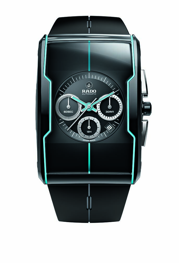 Firma Rado lubi co kilka lat zaskakiwać futurystycznymi modelami. Taki też jest R-One pochodzący z limitowanej serii 300 egzemplarzy. Jego prostokątna koperta (wymiary: 34,6 x 48,5 mm) wykonana została z czarnej ceramiki i ma specjalnie wyprofilowane szafirowe szkło, którego kształt podkreśla niebieska masa świecąca. Taką samą masą pokryte zostały wskazówki oraz dodatkowa linia wizualnie dzieląca tarczę na pół. Ten niepozorny zabieg projektantów przyniósł spektakularny efekt, zwłaszcza kiedy zegarek zostanie umieszczony w ciemnym pomieszczeniu i masa zaczyna świecić. Ciekawy kontrast dla prostokątnej koperty tworzy też okrągła tarcza z datownikiem na godzinie 4.30, małym sekundnikiem na godzinie 9 oraz dwoma licznikami stopera: 30-minutowym i 12-godzinnym. A za wszystkim kryje się automatyczny kaliber ETA 2094 z 37-godzinną rezerwą chodu.