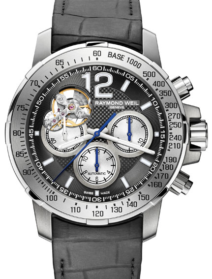 Pochodząca z Genewy marka Raymond Weil oferuje m.in. zegarki inspirowane słynną włoską operą Nabucco. W tym roku, do kolekcji Nabucco dołączył model Nabucco Cuore Vivo, który pochodzi z limitowanej serii obejmującej 400 egzemplarzy. Zegarek opakowany jest w kopertę wykonaną ze stali i tytanu, w której pracuje automatyczny kaliber ETA 7753 ze stoperem. Fragment wychwytu widoczny jest od strony tarczy (przez okno znajdujące się na godzinie 10) i przez przezroczysty dekiel. Sportowy charakter tego czasomierza podkreśla znajdująca się na pierścieniu podziałka tachometru oraz kauczukowy pasek z oryginalnym wzorem przypominającym skórę krokodyla.