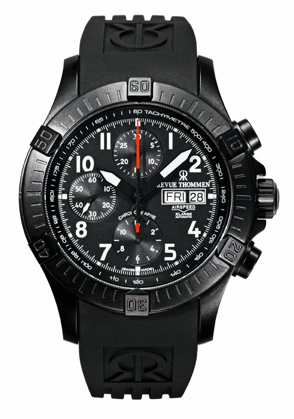 Czerń nadal jest modna. Przekonuje o tym firma Revue Thommen prezentując najnowszy model Airspeed XLarge Power. Jego masywna, 43,5-milimetrowa stalowa koperta pokryta została czarną powłoką PVD. W środku pracuje sprawdzony, automatyczny kaliber Valjoux 7750 ze stoperem, datownikiem oraz wskaźnikiem dnia tygodnia.