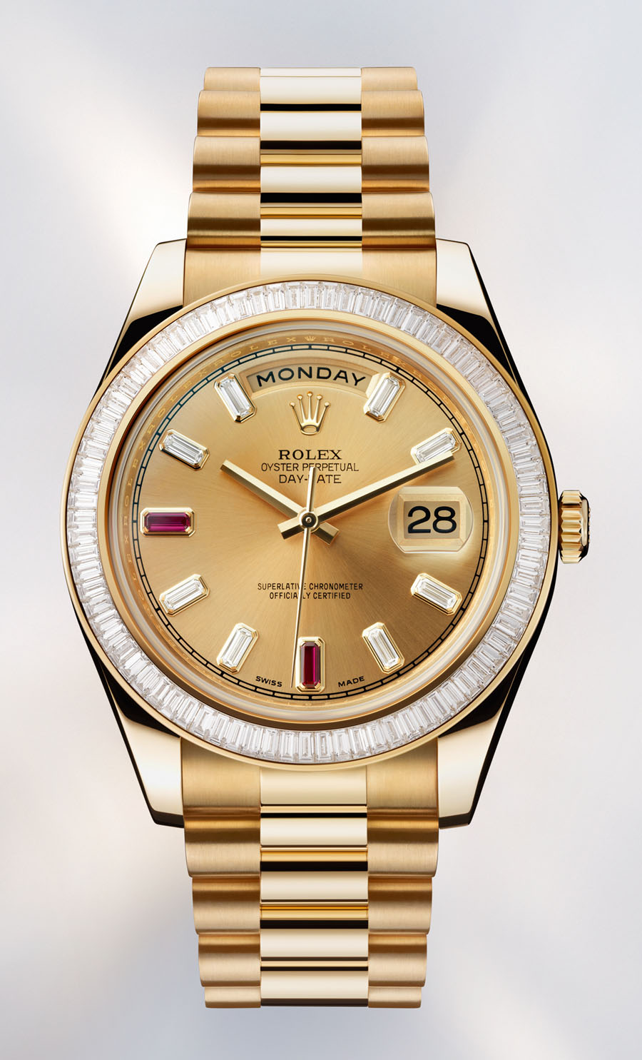 W modelu Oyster Perpetual Day Date II, firma Rolex zachowała typowe dla tej serii wzornictwo, które w wersji Day Date wprowadzone zostało w 1956 roku. Koperta i bransoleta wykonane są z żółtego złota i do tych dwóch elementów dopasowano kolor tarczy. Luksusowy wygląd zegarka podkreślają kamienie szlachetne: osiem diamentów oraz dwa rubiny o szlifie bagietkowym zastępują indeksy godzinowe, a pierścień wysadzany jest 80 diamentami (także o szlifie bagietkowym). W środku 41-milimetrowej koperty pracuje automatyczny kaliber 3156 z datownikiem i wskaźnikiem dnia tygodnia. Cena: 72 700 euro.