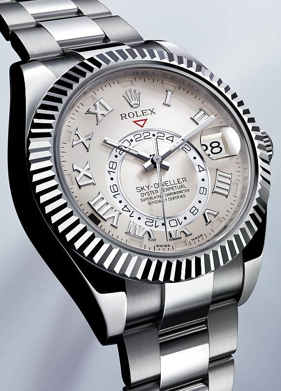 Na tegorocznym Baselworld firma Rolex pokazała zupełnie nowy model. Nazywa się Sky-Dweller i ma wskazania rocznego kalendarza oraz czasu drugiej strefy. Jako napęd tej wyjątkowej jak na zegarek marki Rolex nowości, posłużył nowy kaliber 9001 z całkowicie niezależnie przestawianą wskazówką godzinową, wskazaniami 24-godzinnymi i innowacyjnym rocznym kalendarzem, który „rozróżnia” długości miesięcy i musi być korygowany tylko raz do roku – na przełomie lutego i marca. Mechanizm składa się z 380 części i chroniony jest czterema nowymi patentami (w sumie zastosowano w nim 7 rozwiązań opatentowanych przez firmę Rolex). Ciekawostką jest to, że wskaźnik miesiąca nie pojawia się w tradycyjnym oknie, tylko zaznaczony jest na czarno i umieszczony między brzegiem tarczy, a indeksem godzinowym. Poszczególne funkcje ustawiane są za pomocą obrotowego pierścienia zwanego Ring Command: kiedy pierścień zostanie obrócony odwrotnie do ruchu wskazówek zegara i znajdzie się w pierwszej pozycji (co dokładnie słychać), za pomocą koronki można przestawić wskazania datownika. W drugiej i trzeciej pozycji ustawiany jest czas lokalny i domowy. Model Sky-Dweller dostępny jest w trzech wersjach: w 42-milimetrowej kopercie z białego lub żółtego złota oraz w kopercie ze złota w odcieniu zwanym w firmie Rolex Everose.