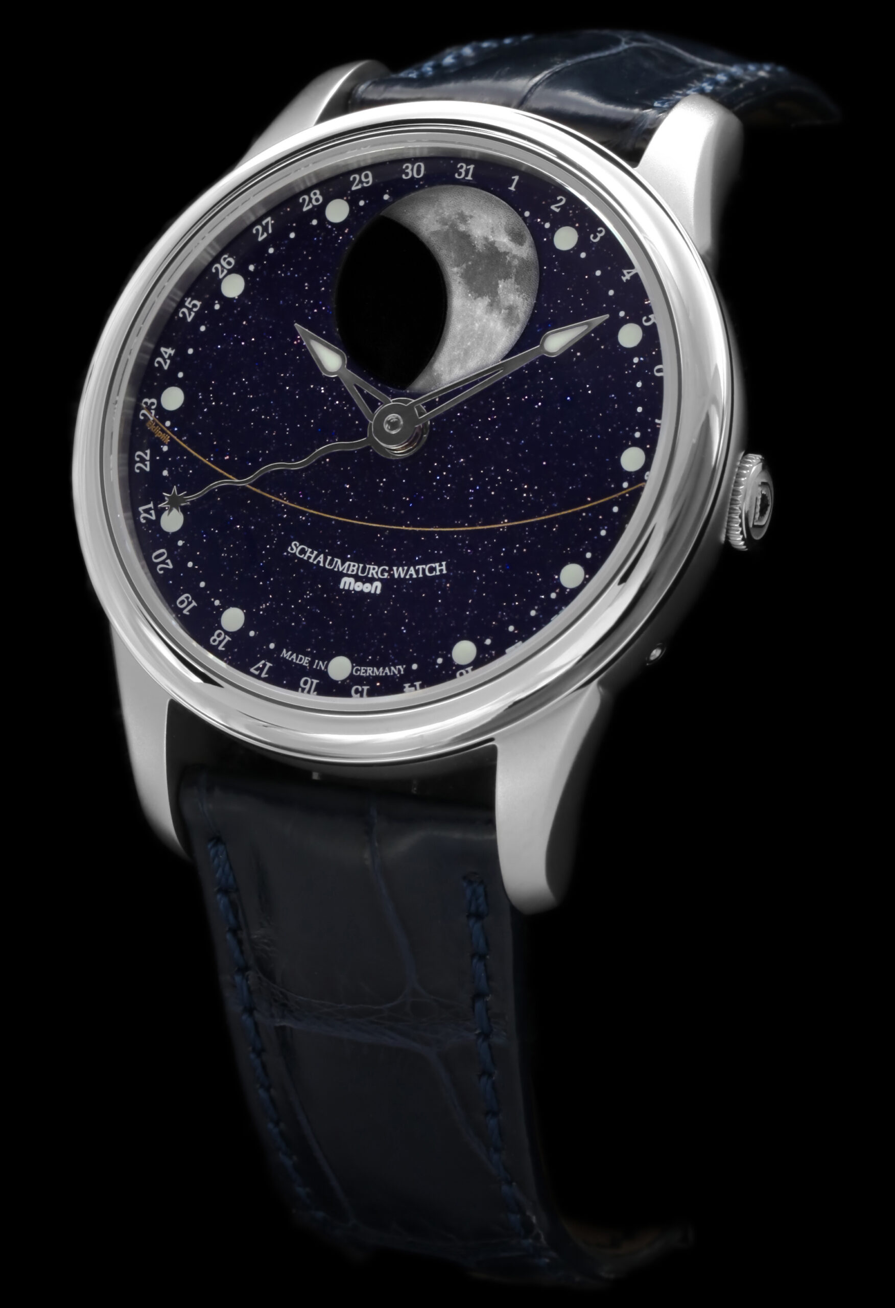 Dla firmy Schaumburg Watch idealnym materiałem wyjściowym do wykonania tarczy modelu MooN Galaxy był materiał nazywany złotym kamieniem, który po raz pierwszy został stworzony przez włoskich alchemików na zlecenie papieża w XVI wieku (miał to być kamień, który łączy niebo i ziemię). Materiał zawdzięcza swoją nazwę właściwościom podobnym do cech złota, czyli błyszczy i topi się w wysokiej temperaturze. Tarcza modelu MooN Galaxy przedstawia obraz nieba z bardzo precyzyjnymi i realistycznie przedstawionymi wskazaniami faz Księżyca dla obu półkul (1-dniowe odchylenie po 122,5 latach). Za tym wyjątkowym dziełem kryje się automatyczny kaliber SW-11 (powstał na podstawie kalibru Soprod A10) z 40-godzinną rezerwą chodu, który pracuje w 43-milimetrowej, stalowej kopercie. Cena: 5000 euro.