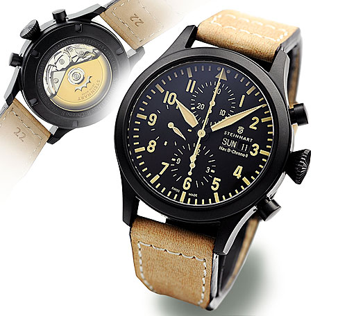 NAV B Chrono Heritage niemieckiej marki Steinhart Watches uzupełnia kolekcję klasycznych modeli dla pilotów. Ma charakterystyczną dla „awiatorów” czytelną tarczę w kolorze czarnym (pokrytą dużą ilością masy świecącej Superluminova, co zdecydowanie poprawia czytelność wskazań w ciemności), dużą poręczną koronkę i typowy, skórzany pasek z widocznymi przeszyciami. Koperta tego ciekawego czasomierza wykonana została ze stali pokrytej czarną, matową powłoką DLC. W środku pracuje sprawdzony, automatyczny kaliber Valjoux 7750 (wersja elabore) ze stoperem, wskaźnikiem dnia tygodnia i datownikiem.