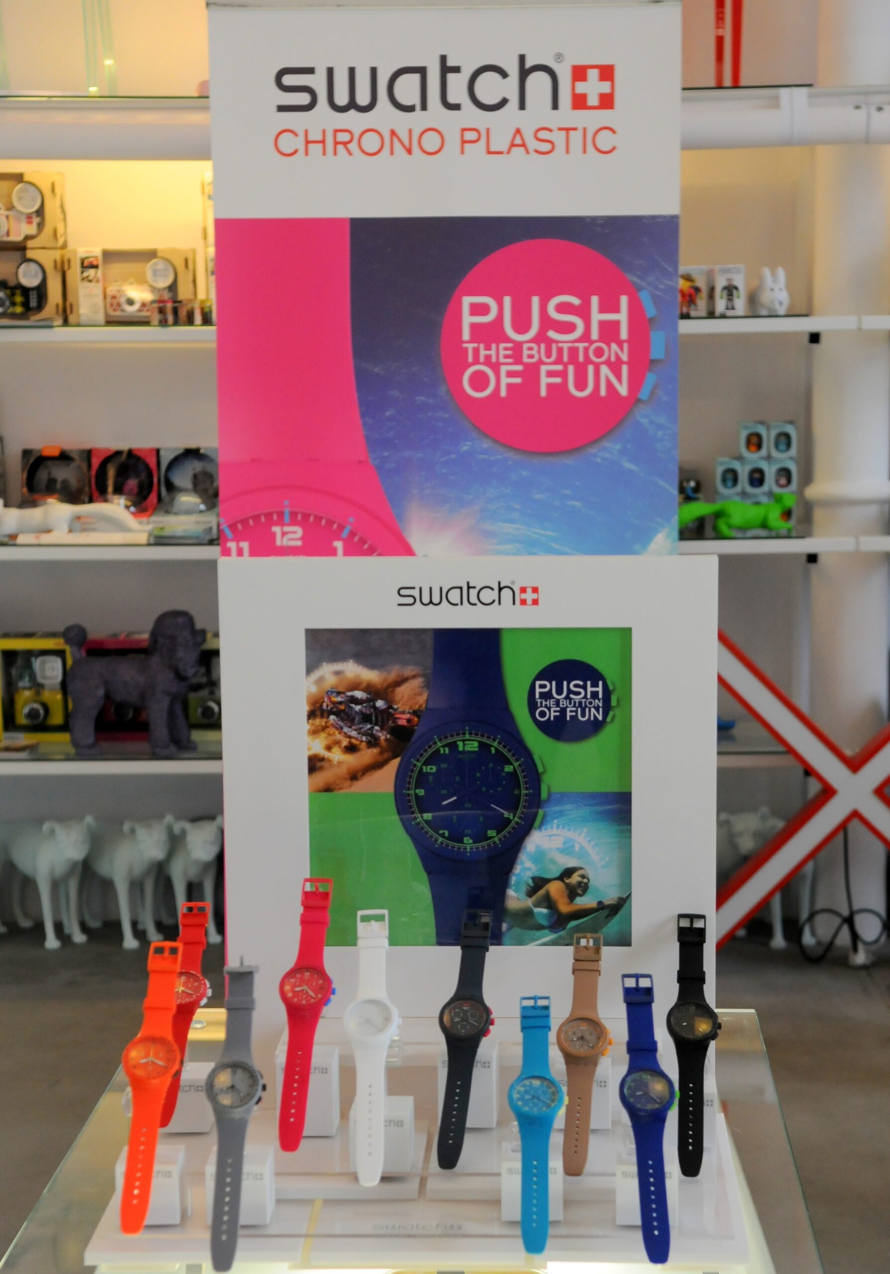 26 czerwca w warszawskiej galerii Pies czy Suka odbyła się prezentacja najnowszej kolekcji Swatch Chrono Plastic, czyli modeli ze stoperem w różnokolorowych wersjach (dostępnych jest dziesięć kolorów: czarny, jasno beżowy, szary, antracytowy, biały, pomarańczowy, czerwony, granatowy, niebieski i różowy). Zegarki wykonane zostały z tworzywa sztucznego i mają silikonowe paski. Na czasie są nie tylko kolory, ale też średnica tych modeli (42 mm). Natomiast dla kobiet, które wolą mniejsze zegarki Swatch stworzył serię Lady Stripes, czyli trzy modele ozdobione kolorowymi paskami (wersja niebieska, fioletowa i różowa).