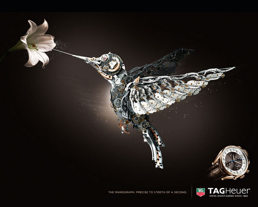 Drugą nagrodę firma TAG Heuer otrzymała za najlepszą kampanię w branży zegarmistrzowskiej wspierającą wprowadzenie na rynek właśnie modelu Carrera Mikrograph. Na rynek trafiły dwie wersje tego zegarka – z brązową oraz szarą tarczą. Obie limitowane do 150 egzemplarzy. Nic więc dziwnego, że reklama musiała być co najmniej tak awangardowa i zaskakująca jak sam produkt. Założenie było jedno – projekt miał oddać hołd sztuce zegarmistrzowskiej jednocześnie gwarantując prosty przekaz: najwyższej precyzji. Opracowana razem z agencją CLM BBDO kampania nawiązuje więc do doskonałości samej natury, przewrotnie wyposażając ją w zegarmistrzowskie komponenty.