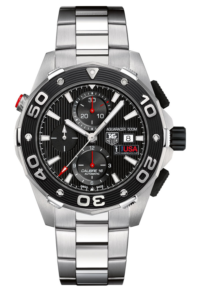 Jako oficjalny partner amerykańskiego teamu Oracle, który bierze udział w regatach o Puchar Ameryki 2012/2013, marka TAG Heuer stworzyła specjalny model należący do serii Aquaracer, obejmującej zegarki dla nurków. Aquaracer 500M Calibre 16 Chronograph Team USA, bo o nim mowa, opakowany jest w 44-milimetrową stalową kopertę o wodoszczelności do 50 atm. Zegarek ma automatyczny zawór helowy oraz jednostronnie obrotowy pierścień z elementem wykonanym z czarnego kauczuku. Pierścień zaprojektowany został w taki sposób, aby nurek mógł go obsługiwać w rękawicach. Jako napęd posłużył automatyczny kaliber Valjoux 7750 ze stoperem i datownikiem. O współpracy z teamem Oracle świadczy m.in. widoczne na tarczy czerwone logo amerykańskiej drużyny oraz napis wygrawerowany na deklu zegarka. Model Aquaracer 500M Calibre 16 Chronograph Team USA dostępny jest w dwóch wersjach: z kauczukowym paskiem lub stalową bransoletą.