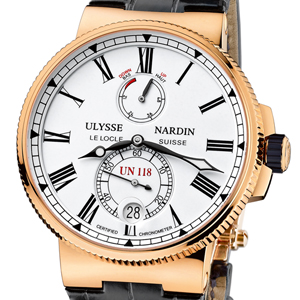 Od ponad 100 lat firma Ulysse Nardin produkuje chronometry morskie i na ten rok zaplanowany jest kolejny, ciekawy model tego typu, czyli Marine Chronometer Manufacture. Tarcza tego klasycznego zegarka została ręcznie wykonana z emalii i utrzymana jest w tradycyjnej stylistyce kojarzonej z chronometrami morskimi. Z kolei, imponujących rozmiarów koperta z różowego złota (średnica 45 mm) ma ciekawie wykończony pierścień i nową, pokrytą kauczukiem koronkę, której konstrukcja bardzo ułatwia nakręcanie oraz ustawianie wskazań. Jednak kreatywność marki Ulysse Nardin widoczna jest przede wszystkim w pochodzącym z własnej manufaktury, nowatorskim kalibrze UN-118, zaprezentowanym po raz pierwszy w 2011 roku. Co nowego oferuje ten automatyczny mechanizm? Zastosowano w nim wychwyt wykonany z materiału zwanego DIAMonSIL, czyli rewolucyjnego połączenia diamentu z krzemem. UN-118 ma 60-godzinną rezerwę chodu (wskazanie rezerwy znajduje się na godzinie 12) i jego dokładność potwierdza certyfikat chronometru wydany przez COSC. Model Marine Chronometer Manufacture dostępny jest w kilku wersjach: w kopercie z różowego złota, z połączenia złota z tytanem lub stali z tytanem. Seria limitowana do 350 egzemplarzy.