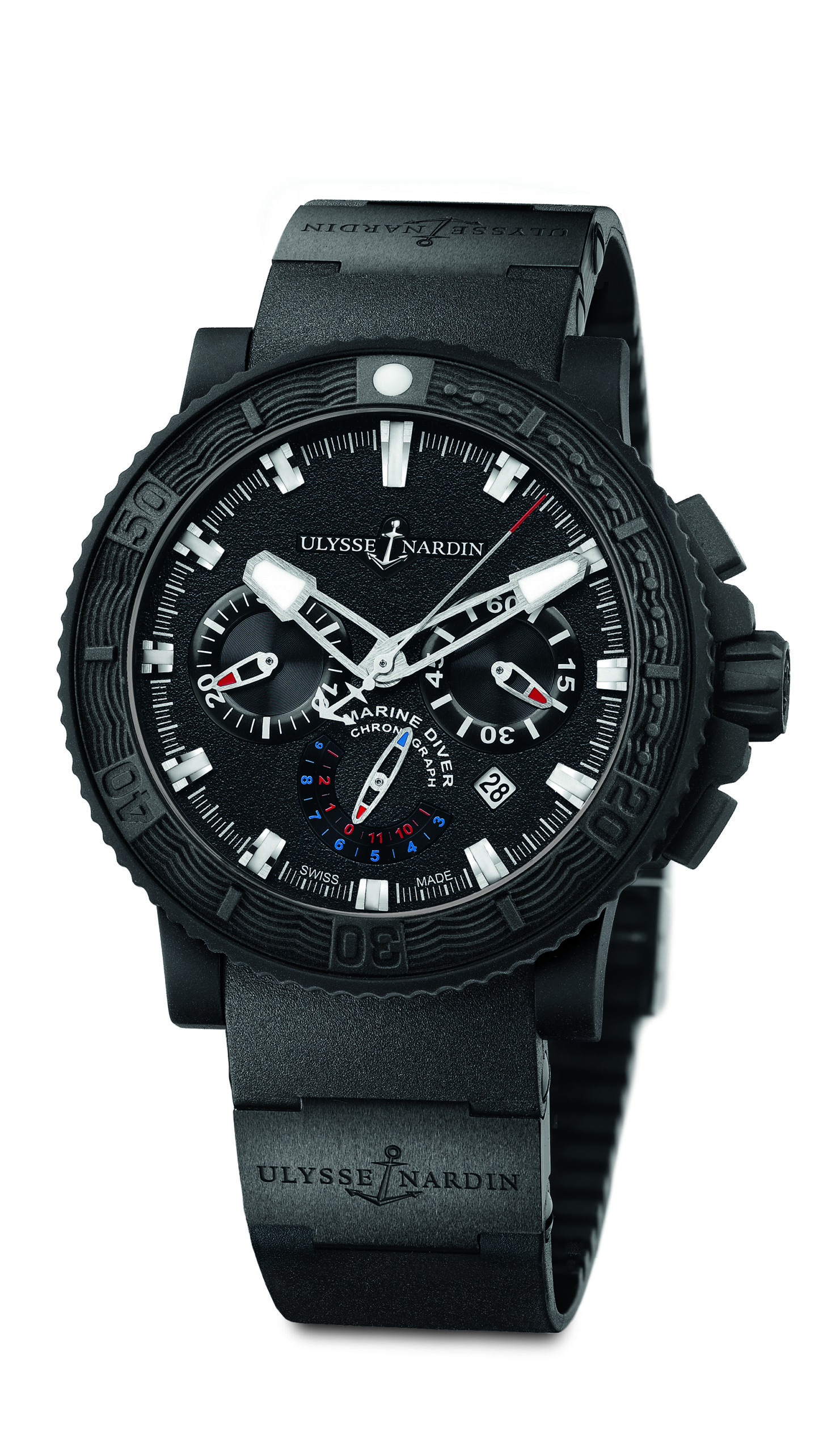 Czerń nadal jest bardzo modna, co widać na przykładzie chociażby modelu Black Sea Chronograph marki Ulysse Nardin. Jego masywna, bo aż 45,8-milimetrowa koperta wykonana została ze stali powleczonej matowym, wulkanizowanym kauczukiem i jest wodoszczelna do 20 atm. Kauczukiem pokryte są też inne elementy: jednostronnie obrotowy pierścień, na którym umieszczona jest podziałka minutowa, koronka oraz przyciski służące do obsługi stopera. Jako napęd tego sportowego „nurka” wykorzystano automatyczny kaliber UN-35 ze stoperem (licznik 30-minutowy znajduje się na godzinie 9, 12-godzinny na godzinie 6), małym sekundnikiem na godzinie 3 oraz datownikiem między godziną 4, a 5. Całość uzupełnia czarny, kauczukowy pasek z dwoma ceramicznymi ogniwami ozdobionymi logo marki i zakończony zapięciem na klips.