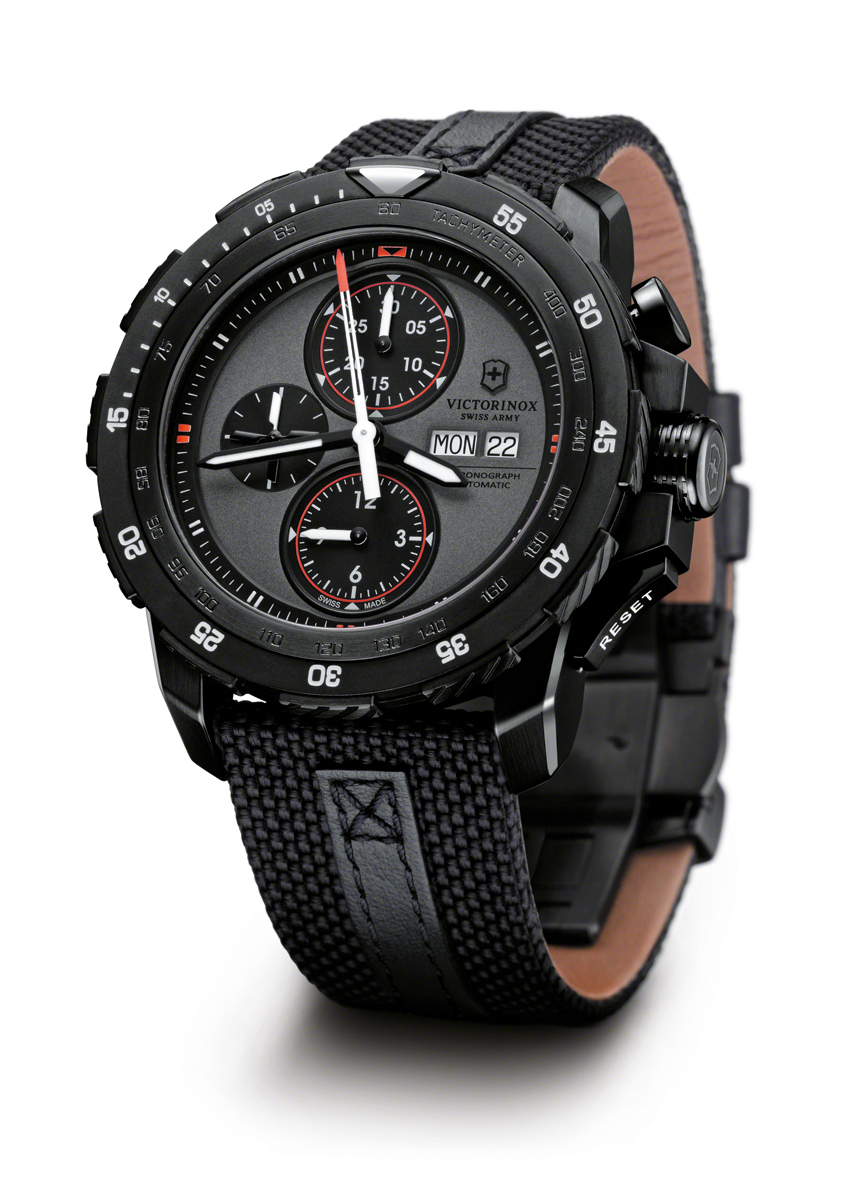 Nazwa zegarka pochodzi od znajdującej się w sercu Alp bazy wojskowej wykorzystywanej przez Swiss Air Force, a bezpośrednią inspiracją dla jego stworzenia był słynny, wyposażony w podwójny wirnik śmigłowiec Cougar AS 532. Dlatego model Alpnach Mechanical Chronograph ma najbardziej wyraziste wzornictwo ze wszystkich modeli wyprodukowanych do tej pory przez szwajcarską firmę Victorinox. Najważniejsze szczegóły zegarka nawiązują swoim wyglądem do wyglądu łopatek wirnika, kokpitu, drążka sterowego oraz turbin. Tarcza została zaprojektowana w bardzo prosty sposób, nie ma na niej więc żadnych zbędnych elementów. Tarcze dodatkowe otoczone są zielonym, czerwonym lub pomarańczowym pierścieniem: to nawiązanie do urządzeń pomiarowych w kokpicie śmigłowca Cougar, gdzie kolorowe linie uwypuklają najważniejsze wskaźniki. Dodatkowo liczniki godzin i minut zostały powiększone, dzięki czemu tarcza jest bardziej przejrzysta i czytelna. Licznik małego sekundnika znajdujący się na godzinie 9 ma dokładnie ten sam kształt, co łopatki wirnika Cougara. Poręczna i łatwa w obsłudze koronka oraz obrotowy pierścień z odliczaniem wstecznym, pokryte są czarną powłoką PVD. Ich wzór przypomina wygląd turbiny śmigłowca. Natomiast przycisk „Reset” umieszczony przy godzinie 4 jest podobny do uchwytu drążka sterowego, którego pilot używa do sterowania śmigłowcem. W 44-milimetrowej, stalowej kopercie (wodoszczelność do 10 atm.) pracuje automatyczny kaliber Valjoux 7750 ze stoperem. Jego wahnik pokryty został powłoką PVD i jest widoczny przez okno w deklu. Dodatkowo, od strony dekla Alpnach jest ozdobiony herbem Szwajcarskich Sił Powietrznych. Alpnach w wersji 241530 Special Edition kosztuje 10 400 zł, natomiast w tej podstawowej 241527 oraz 241528: 9 400 zł.