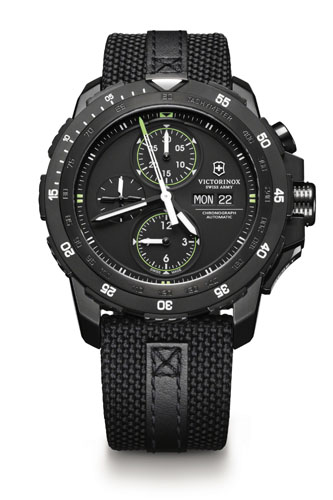 Nazwy modeli firmy Victorinox pochodzą od nazwy bazy śmigłowców szwajcarskich sił powietrznych, która znajduje się w małej gminie Alpnach w kantonie Obwalden. Tym razem, inspiracją dla projektantów nowego zegarka Alpnach Mechanical Chronograph był helikopter Cougar. Liczniki stopera znajdujące się na godzinie 12 oraz 6 zostały dodatkowo podkreślone zielonymi okręgami, podobnie jak liczniki w kokpicie helikoptera. Z kolei, podziałkę minutową przeniesiono na obrotowy pierścień otaczający tarczę. Czasomierz ma także podziałkę tachometru, za pomocą której można obliczać średnią prędkość, nawet tę nieprzekraczającą 60 km/h. Do wyglądu helikopterów nawiązują także: wskazówka małego sekundnika na godzinie 9, która przypomina śmigło, a także powierzchnia koronki oraz obrotowego pierścienia, których wygląd przypomina elementy turbiny. Koperta tego oryginalnego czasomierza pokryta została czarną powłoką PVD. Wewnątrz pracuje automatyczny kaliber ETA/Valjoux 7750, który widoczny jest przez przezroczysty dekiel. Całość uzupełnia nylonowy pasek.