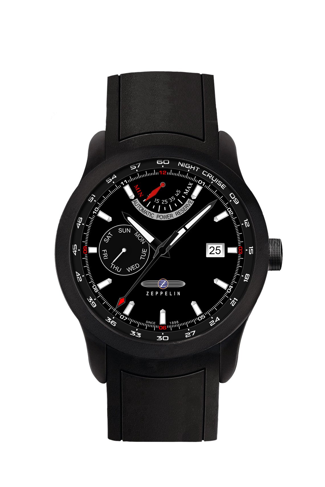 Model 7260-2 to nowość firmy POINTtec z Monachium. Ten niemiecki producent znany dotychczas z klasycznych i trochę „staromodnych” zegarków z logo Zeppelin, zaprezentował w tym roku nową serię Night Cruise. Nowoczesny design i modyfikowany w POINTtec automatyczny mechanizm firmy Citizen powinny być atutem dla tej serii. W niekonwencjonalny sposób na tarczy umieszczone zostały wskazania rezerwy chodu oraz dnia tygodnia. Koperta o średnicy 42 mm jest pokryta czarną powłoką PVD i ma przezroczysty dekiel. Cena: 449 euro.